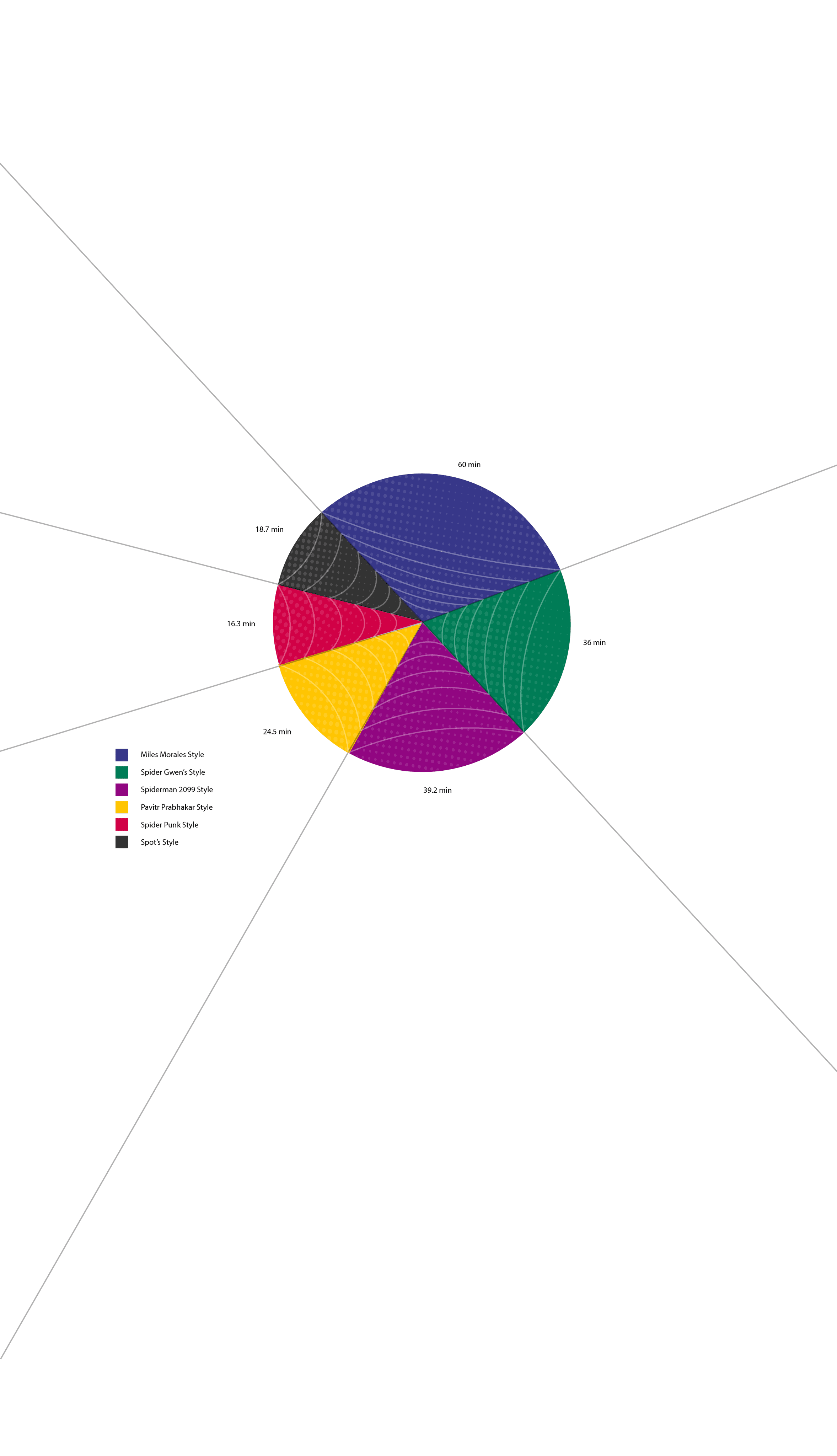 The Miles Morales style of animation is the most seen in the movie, overlapping or not. While the animation of the least duration is that of Spider Punk. Spider Punk animation style is usually seen overlapping with others and it is interesting how the unique paper cut style blends with the other 2D characters. Spot, the villain, has minimal individual scenes, but this uniquely designed character is mostly seen overlapping with Miles Morales' timeline.